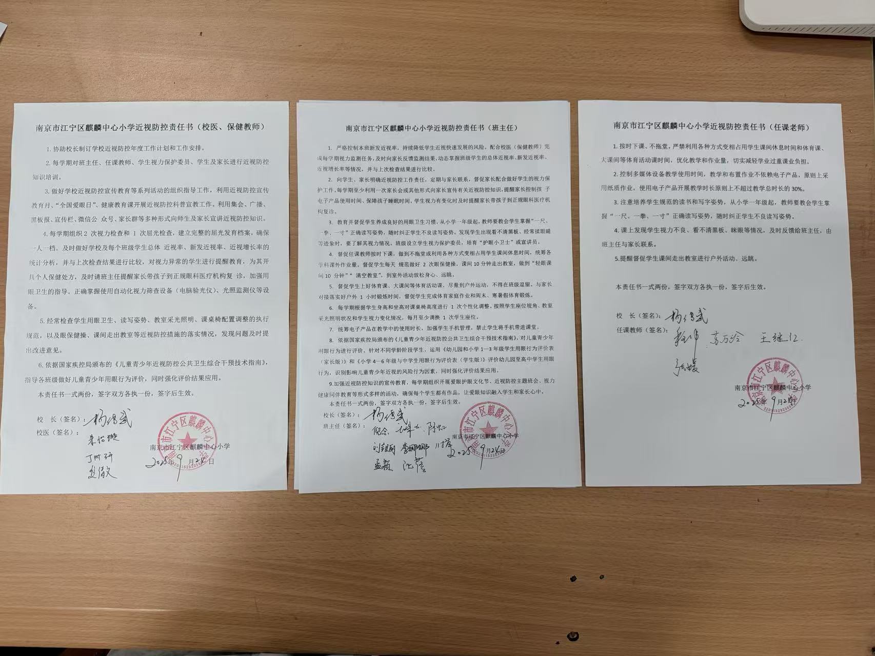 为将近视防控工作落到实处,我校建立了科学、严谨的防控责任体系。学校隆重举行了近视防控责任书签署仪式,校医、班主任、任课老师等不同岗位的教职员工分别与校长签署了《近视防控责任书》,明确了各自在减轻学生课业负担、纠正不良读写姿势、保障户外活动时间等方面的具体职责。同时,各班还民主选举产生了“学生视力保护委员”,作为班级防近工作的小助手和监督员。这一“纵向到底、横向到边”的网格化管理模式,确保了近视防控工作人人有责、层层落实。