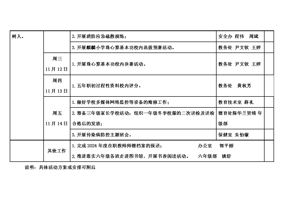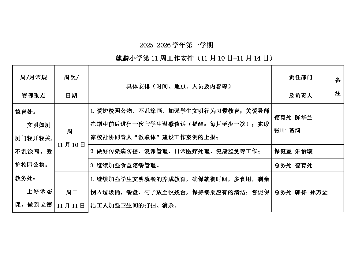 麒麟小学2025-2026学年第一学期第11周工作安排