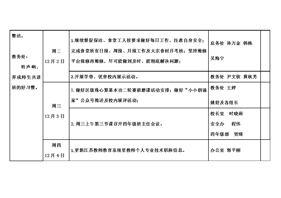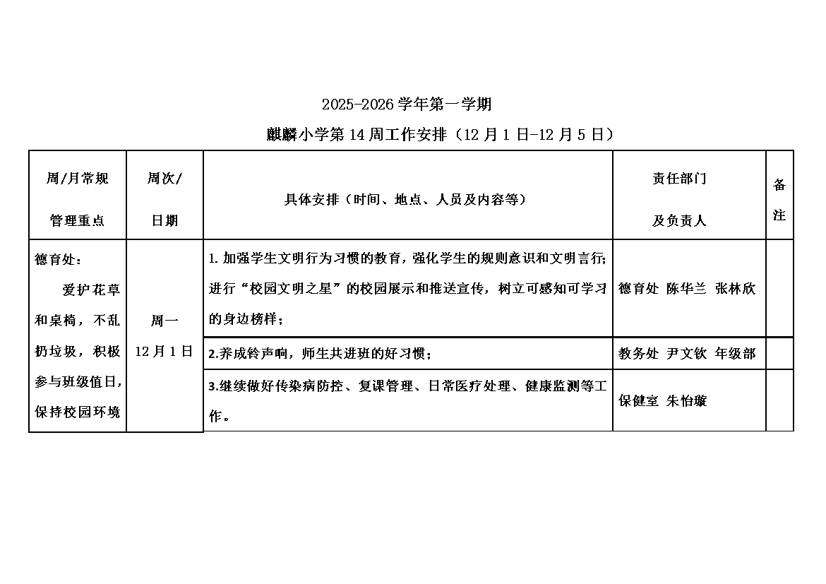 麒麟小学2025-2026学年第一学期第14周工作安排