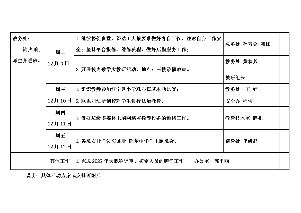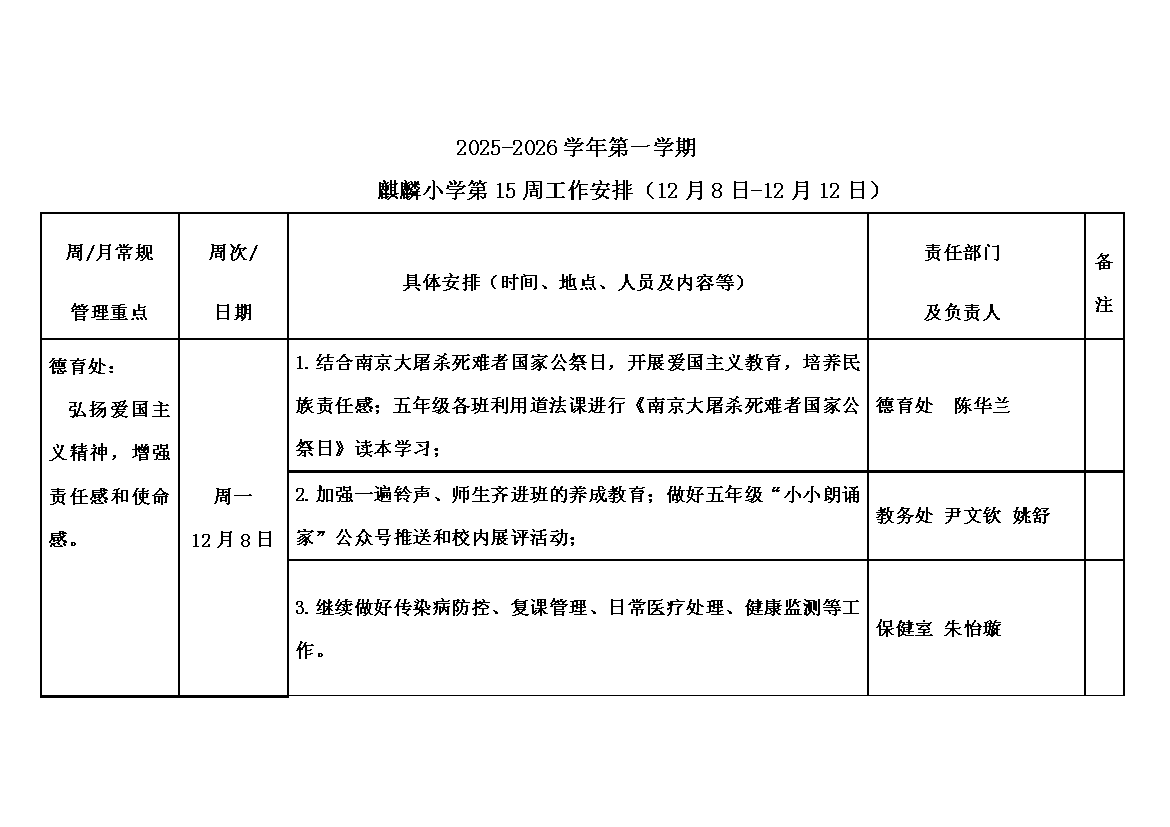 麒麟小学2025-2026学年第一学期第15周工作安排
