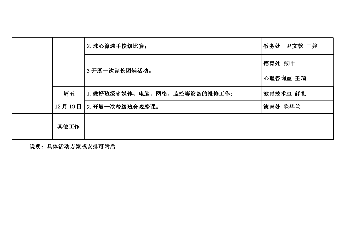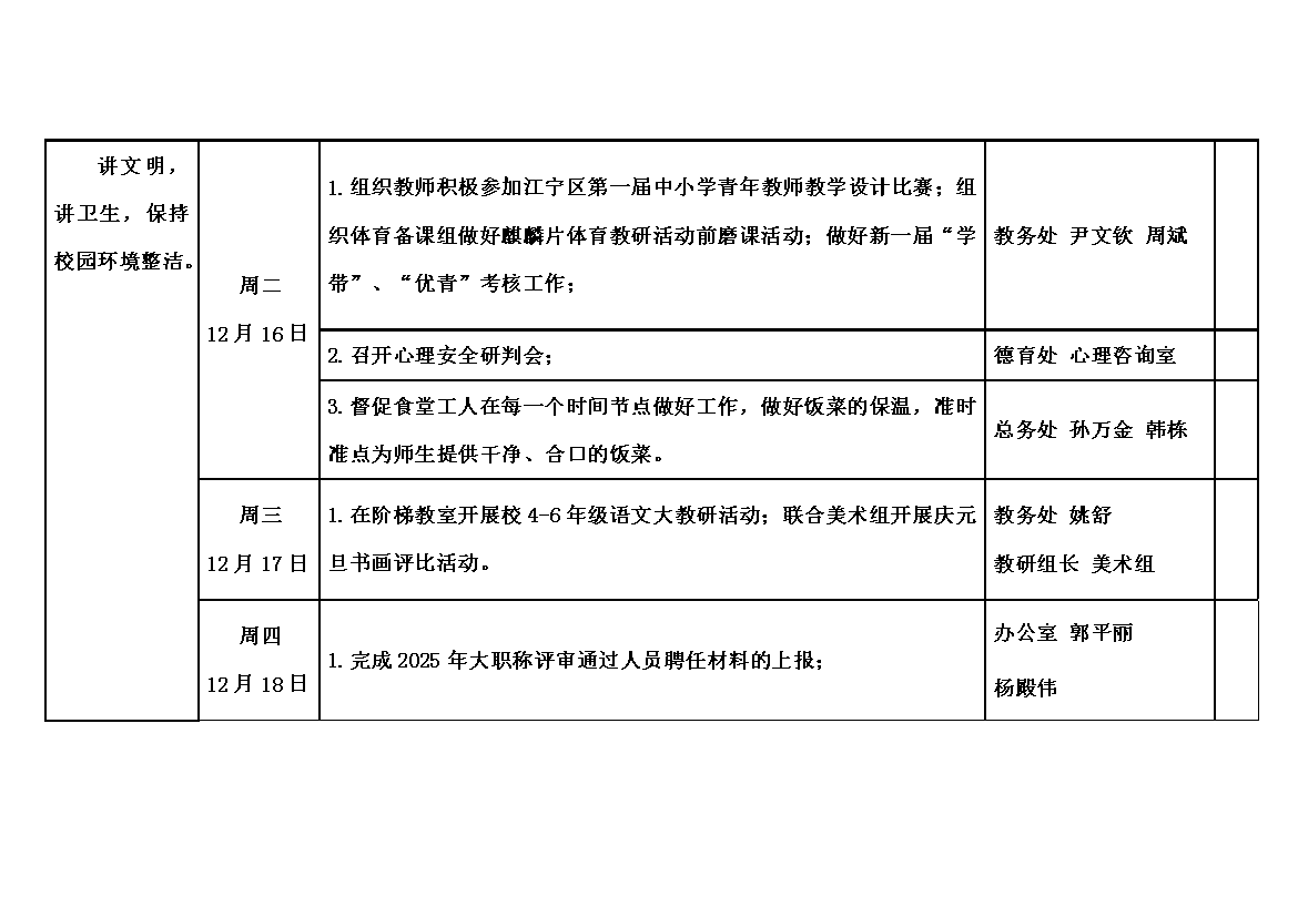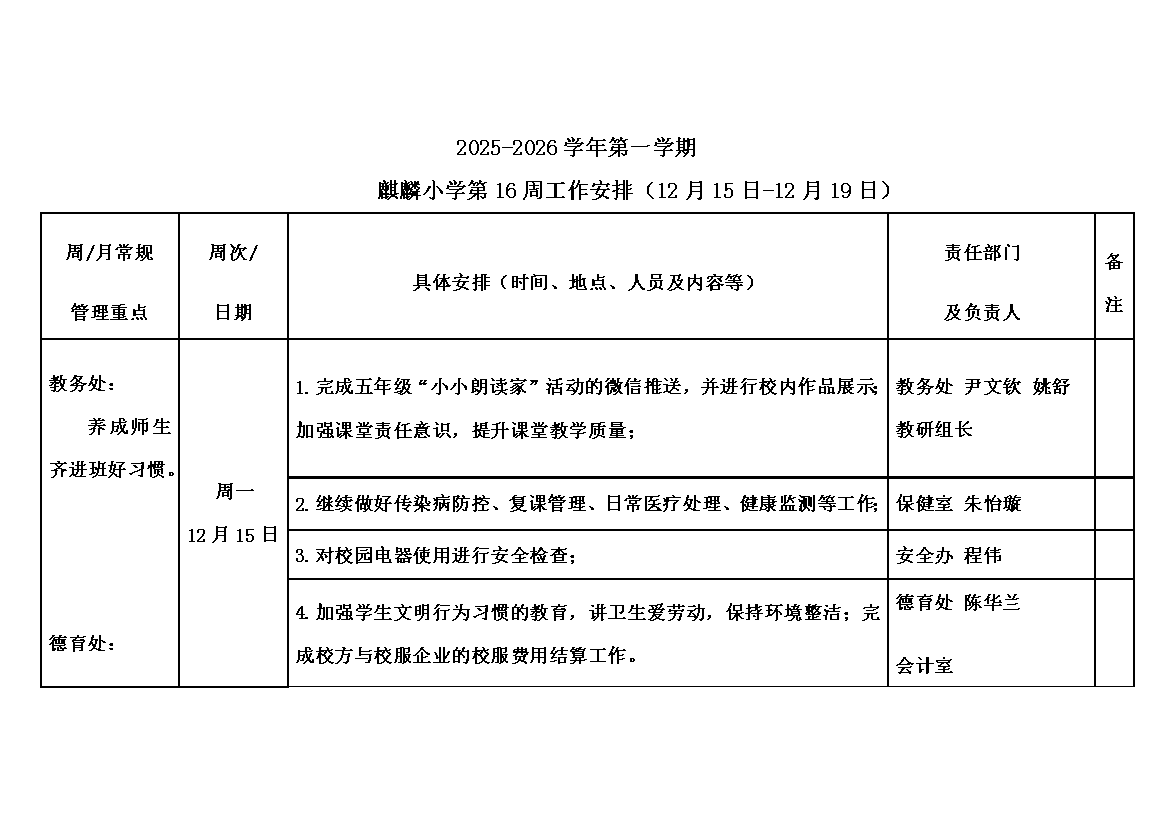 麒麟小学2025-2026学年第一学期第16周工作安排